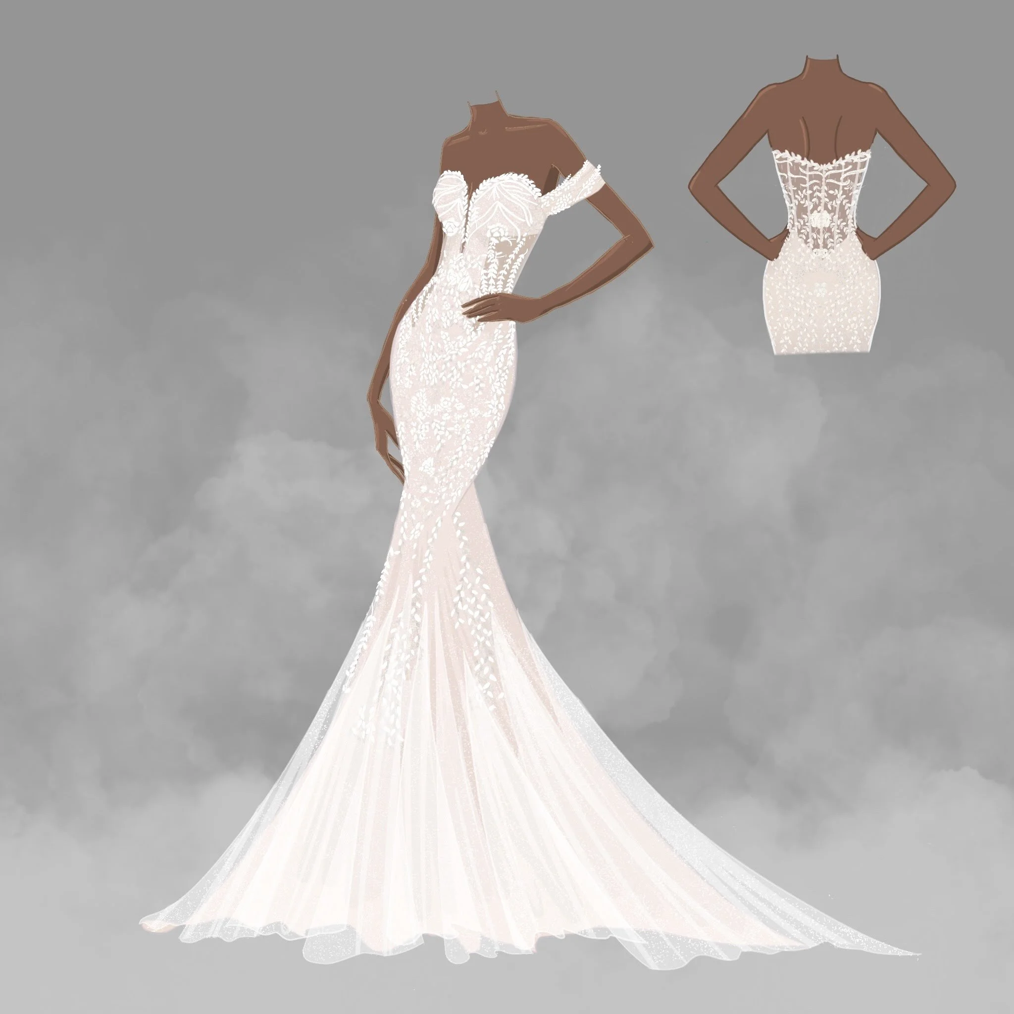 Sketches: Sketches are sent out to brides approximately 8-10 weeks after payment is made and contract is signed. Sketches are only available for full custom dresses. However, it can be purchased for $100 with semi custom or no custom orders. Please review your sketch and pay close attention to things like: Neckline shape and style, general lace placement, detachable pieces ETC. Please note that things like train length, sparkle layers, specific lace placement, color and the like are hard to depict in sketches. Please know that sketches are an artistic presentation of your dress. It doesn’t dictate the lace mapping process. If you have any questions, please don’t hesitate to contact us.